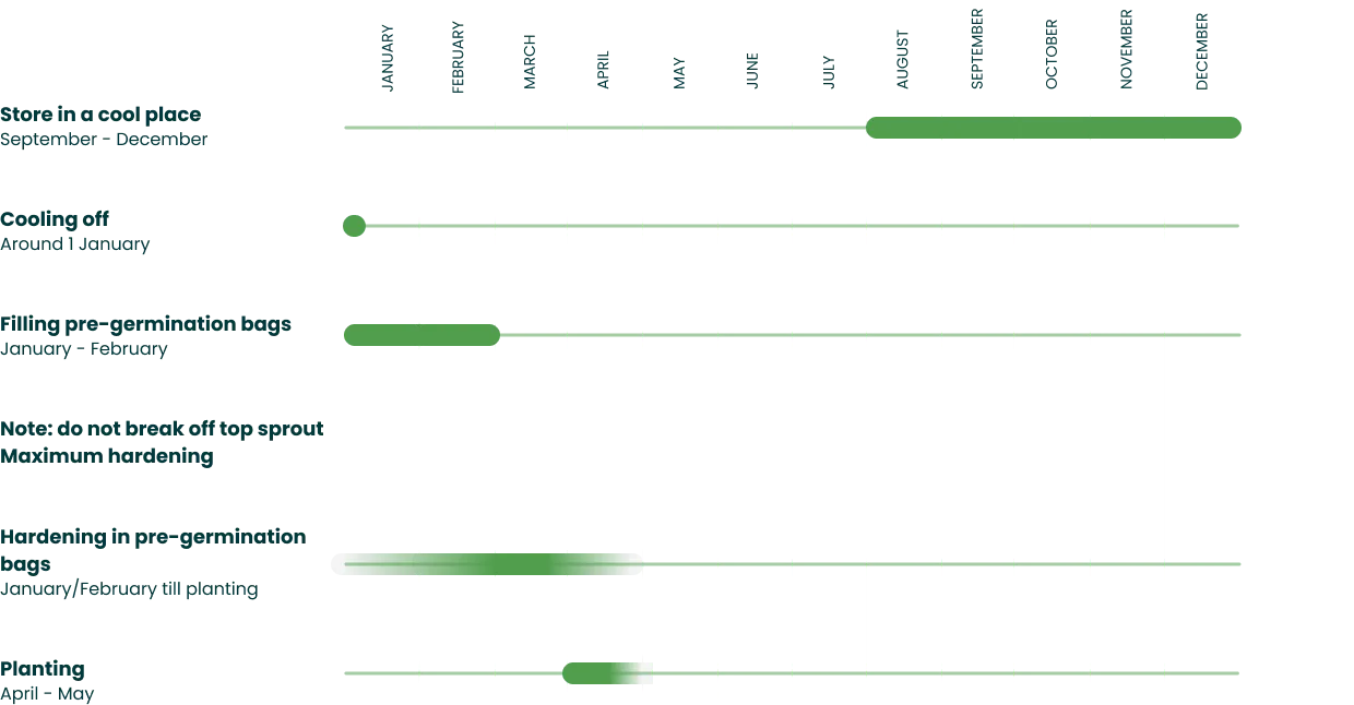* ALL ADVICE GIVEN APPLIES TO AVERAGE CONDITIONS IN THE NETHERLANDS. AS WE HAVE NO INFLUENCE ON THE QUALITY OF SEED POTATOES, WEATHER, BUILDINGS, MACHINERY AND THE EXPERTISE OF THE USER, WE CANNOT ACCEPT ANY LIABILITY FOR THE RESULTS.