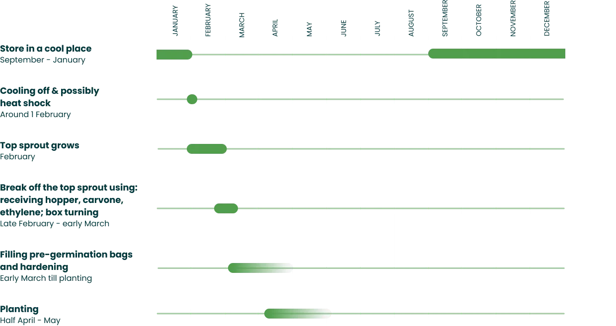 * ALL ADVICE GIVEN APPLIES TO AVERAGE CONDITIONS IN THE NETHERLANDS. AS WE HAVE NO INFLUENCE ON THE QUALITY OF SEED POTATOES, WEATHER, BUILDINGS, MACHINERY AND THE EXPERTISE OF THE USER, WE CANNOT ACCEPT ANY LIABILITY FOR THE RESULTS.